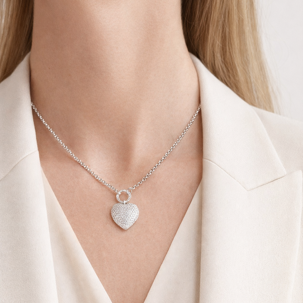Upptäck Heart of Pavé halsband — ett gnistrande statement‑smycke som fångar blickar och hjärtan. Med sitt stora tredimensionella hjärta täckt av kristaller reflekterar detta halsband ljus på vackert sätt och ger varje outfit en glamorös touch.