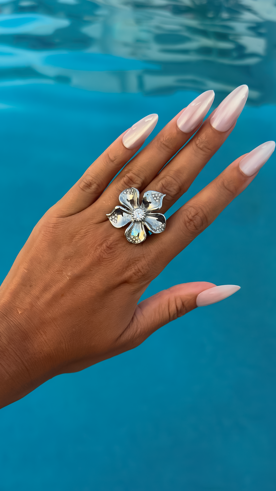 En tidlös statement‑ring i form av en blomma med gnistrande vita kristaller – en perfekt balans mellan elegans och modern design. Ringen finns i 2 storlekar, vilket gör att den är passande för de flesta fingrar.