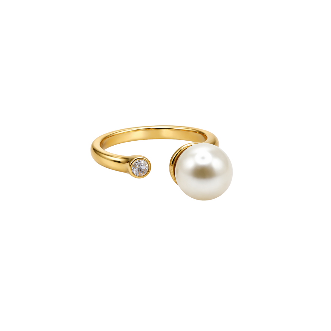 Möt Linear Pearl Luxe ring – där klassisk skönhet möter modern minimalism. Den öppna designen pryds av en stor, glänsande pärla på ena sidan och en gnistrande kristall på den andra. Balansen mellan de två elementen ger ringen ett lyxigt men ändå avslappnat uttryck.
